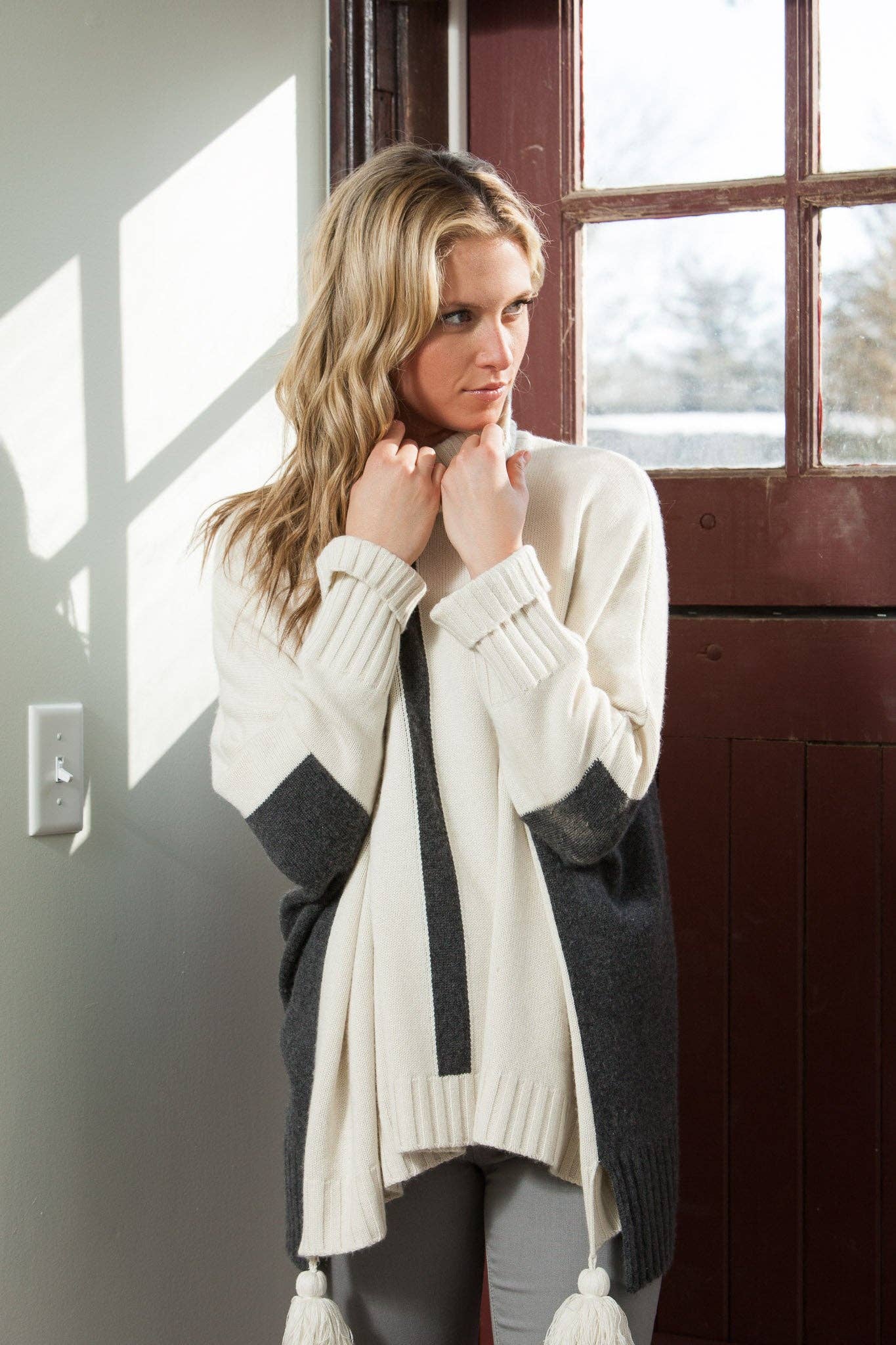 The Devon Poncho is the perfect pullover for a cool night. It is versatile and can be worn to Events, or just cozying up by the fire place. * Wool/Cashmere * Turtleneck with flattering color block details * Boxy fit Pullover * Vented hem with tassels at front * Hand wash cold low spin and lay flat in cool dry place to Dry clean * One Size