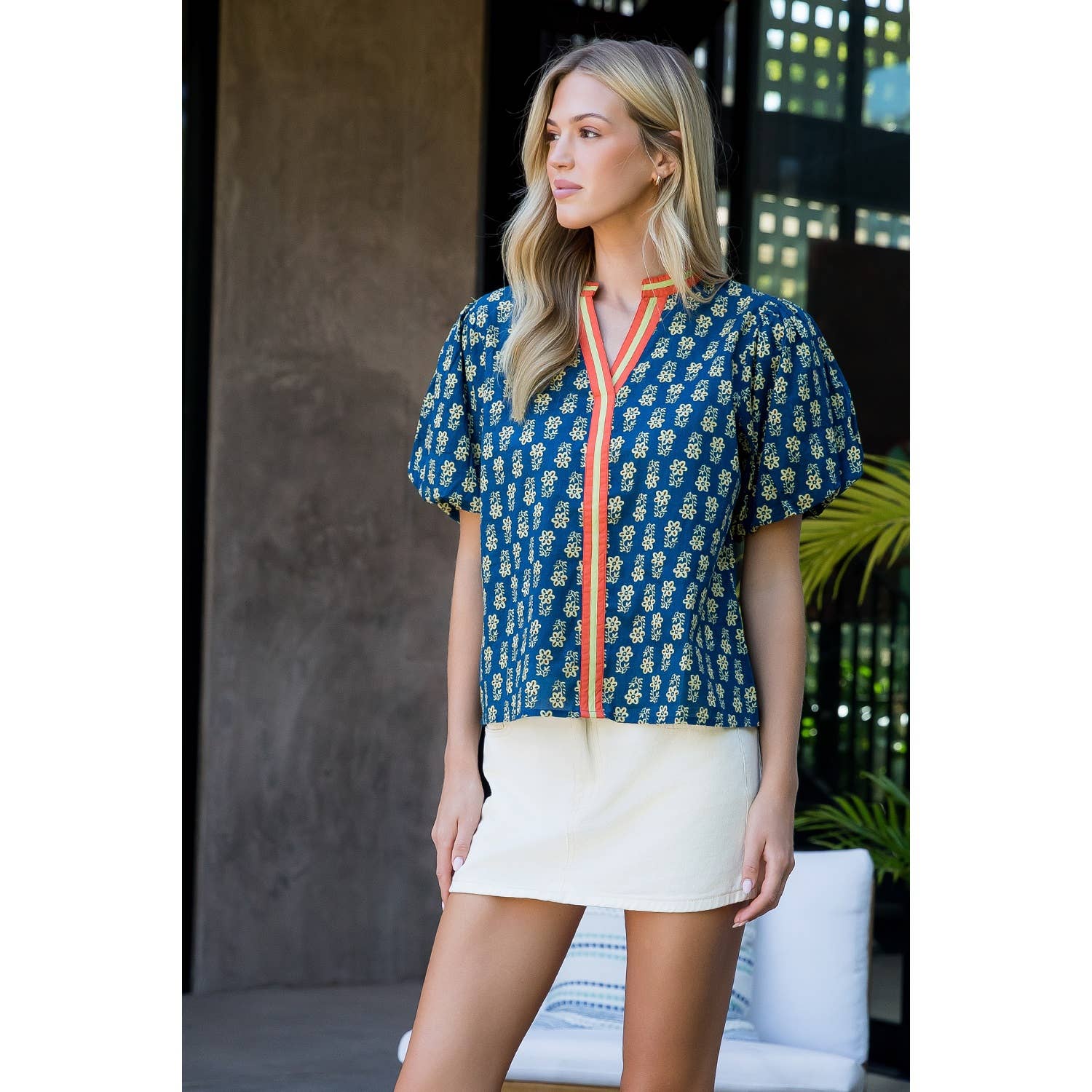 Blue cotton with contrasting trim, this top is a perfect call for fall! As the weather changes, a cool top like this meets the challenge of being the right fabric in the right colors.